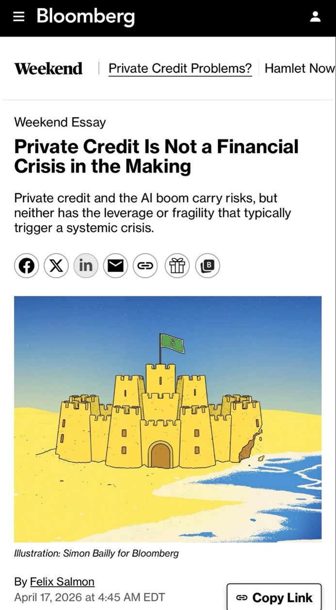 The article goes all out in protecting private credit. The article acknowledges the risks in the private credit market but claims the losses will be more easily absorbed. We disagree. The mega funds are extremely levered, aligned with private equity funds, and not marking to market their assets. Expect more loan losses, write-downs, and poor returns for investors as many of these funds begin to unwind.