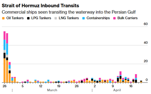 We are not sure what will happen as the situation is littered with uncertainty and opaqueness. It seems every party involved, including intermediaries, has a separate view on the conflict, which is all being reported in the media. We continue to believe this conflict will not be resolved quickly, but likely at this stage will not accelerate. The one thing that is becoming clearer is that this conflict could begin to spill over into geopolitics across the world. China’s leadership is reportedly very displeased with the blockage in the Strait, which it says is impacting regional and international commerce. If a peace deal is not agreed upon, China will reportedly delay its May summit with the U.S.