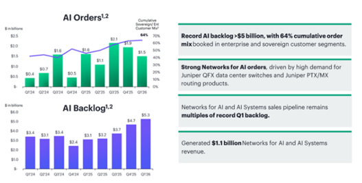 HPE reported a record AI order backlog in its March earnings report, and analysts have forecasted that to increase as demand remains robust and supply constraints impact production for them and the industry. Here is a slide from HPE’s quarterly presentation, which tracks the company’s AI order backlog: