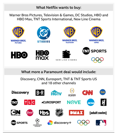 We will say Paramount and Netflix’s offers are hard to compare, as Netflix is not buying Warner’s substantial cable assets while Paramount is. Any comparison of the deal would require determining the value of Warner’s cable assets and a breakdown of debt between the businesses. Paramount’s CEO said they offered a better deal for Warner shareholders, and the company has a responsibility as a fiduciary to consider the all-cash offer. Here are the assets that Netflix and Paramount are targeting: