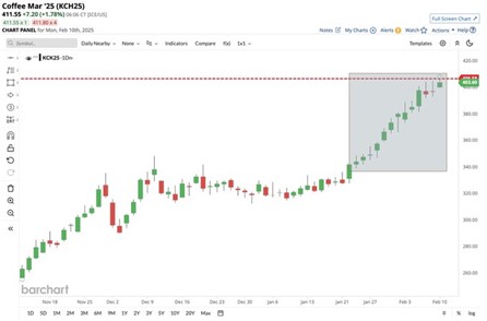 Consumers will more than likely face higher coffee prices at their local cafes or Starbucks moving forward. Coffee prices increased by 6% on Monday morning and marked a fresh all-time high for its 12th consecutive trading session.