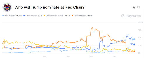 According to Kalshi, there is a 48% probability that Trump’s nominee to be the next FED Chairman will be Rick Reider. Polymarket has similar odds for Reider. However, on December 18th, Reider’s odds sat at just 1.7%, quite the change over one month. For those interested here is the chart from Polymarket that tracks these odds: