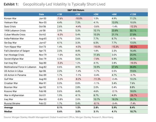 A geopolitical event does not mean it’s a doomsday by any means for financial markets. Morgan Stanley’s above research went on to say that unless oil spikes in a historical manner, this conflict will not change their bullish view on equity markets for the next six to twelve months.