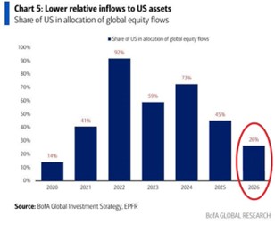 According to Bank of America, only 26% of global equity flows in 2026 are going to U.S. funds. This is the lowest level in 5 years, and a sharp decline compared to the last 4 years. The world went on a buying spree in U.S. markets due to the success of the Magnificent 7 and the FAANG stocks. These stocks now trade at elevated valuations and are spending at will on AI capex. This spending has investors worries and investors are now finally looking for non-U.S. exposure (in size).