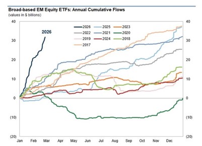 This decrease in U.S. inflows has not impacted overall equity allocation. According to Bank of America Global Investment Strategy, global equity funds recorded $38.1 billion in inflows last week. Global equity funds are expected to have $1.1 trillion in inflows this year, surpassing the 2025 record of $826 billion. Although investors are worried, they are not changing their allocations dramatically. They are making small tactical decisions and diversifying their equity exposure. According to Barchart, emerging market-based ETFs have seen record inflows to start 2026, where investors have bought $32 billion in EM ETFs in the first 2 months of 2026.