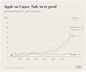 Much can be said about hyperscalers and their investment in capex in today’s markets. Companies are investing hundreds of billions in AI data centers, power generation, and semiconductor chips. The company’s leading the way are amongst the world’s largest companies, including Amazon, Microsoft, and Alphabet. Big tech has found their next major endeavour, and they are all piling in, all but one that is. Apple has not spent heavily on AI capex and does not (as of now) plan to do so. Apple’s capex spending actually shrunk on a quarterly basis by 19%.